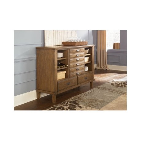 Высокий стол для сервировочных принадлежностей выполнен с минималистической лаконичностью и слегка состарен, что позволяет его отнести к винтажному направлению. Оригинальные ручки неброские, но функциональные, расположены на пяти ящиках с плавным выдвижным механизмом. Вместительные полки, предназначенные для посуды, легко можно использовать для размещения винных бутылок.