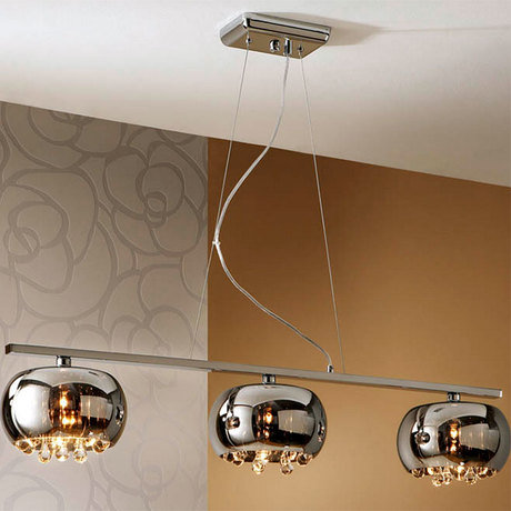 Подвесной светильник ARGOS выполнен в виде трех плафонов из зеркального стекла размещенных на хромированном основании. Середина каждого плафона декорирована подвесками из прозрачного стекла, имитирующее муранское. Система крепления - хромированный металл. Высота светильника регулируемая до 140 см.