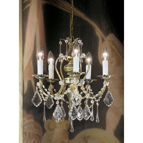 Люстра 5-ти рожковая из коллекции OLD STYLE на арматуре из металла, покрытого золотом в 24K с патиной. Декор: прозрачные подвески с кулонами из хрусталя. Высота светильника регулируется за счет звеньев цепи.